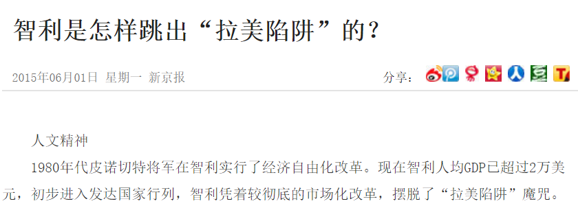 本文开头截图的,2016年《专家称智利摆脱“中等收入陷阱”经验值得借鉴》的文章称,智利的经验就是坚持渐进式金融改革,并未完全听信芝加哥男孩的新自由主义建议,一方面坚持市场化改革,坚持开放,另一方面实行稳健的财政政策和货币政策;不断完善社会保障体系,积极践行“社会公正增长”理念,实行一系列促进均衡分配和社会公正的改革举措,将市场改革、经济增长与社会公正有机结合起来;实行积极财政政策,扶持中小企业发展,促进就业。