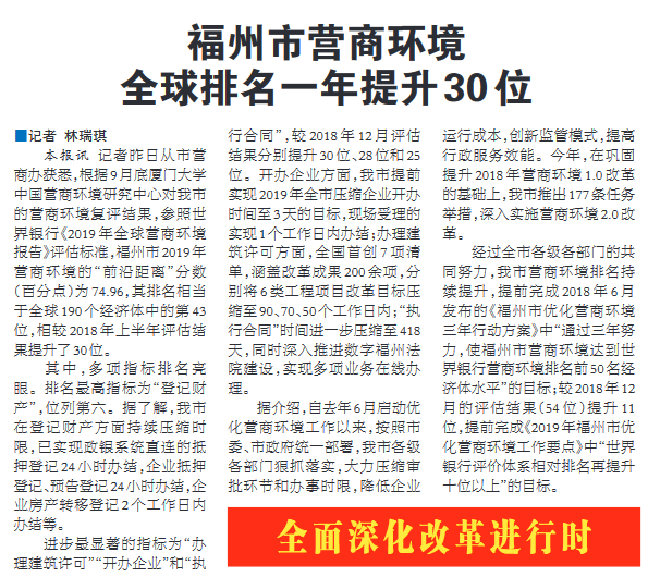 经过全市各级各部门的共同努力,我市营商环境排名持续提升,提前完成2018年6月发布的《福州市优化营商环境三年行动方案》中“通过三年努力,使福州市营商环境达到世界银行营商环境排名前50名经济体水平”的目标;较2018年12月的评估结果(54位)提升11位,提前完成《2019年福州市优化营商环境工作要点》中“世界银行评价体系相对排名再提升十位以上”的目标。