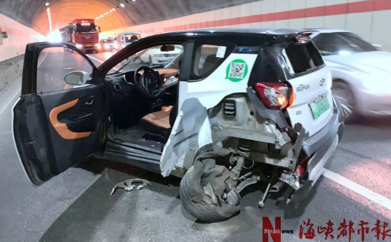今年8月5日,下午2时许,福州快安隧道内发生一起车祸,一辆gofun共享汽车因没电停在车道上,后方一辆的士因躲避不及追尾,两车受损严重,gofun共享汽车司机也受了伤。