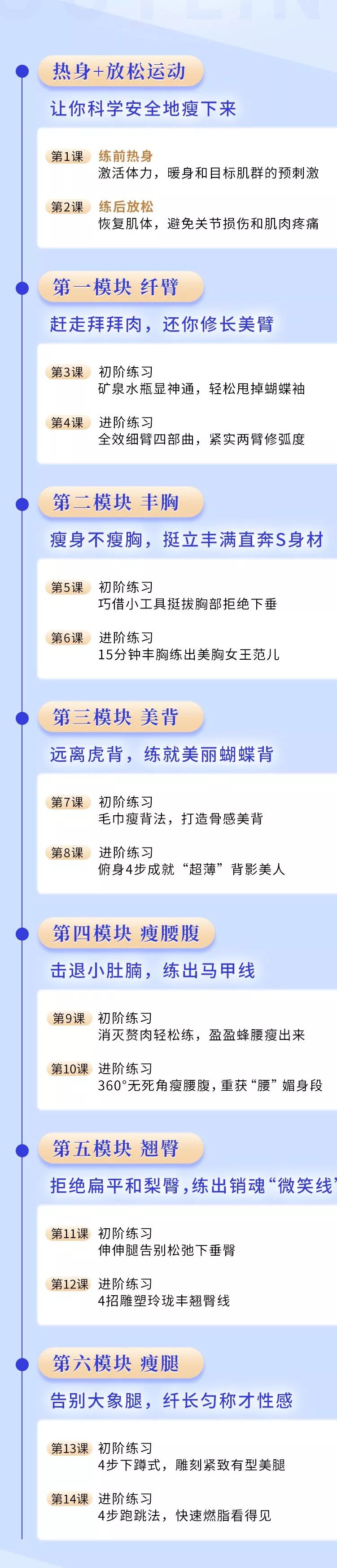 课程一共有14个课时,针对6个身体部位,用14套方案、60个瘦身姿势,带大家局部精准瘦身。