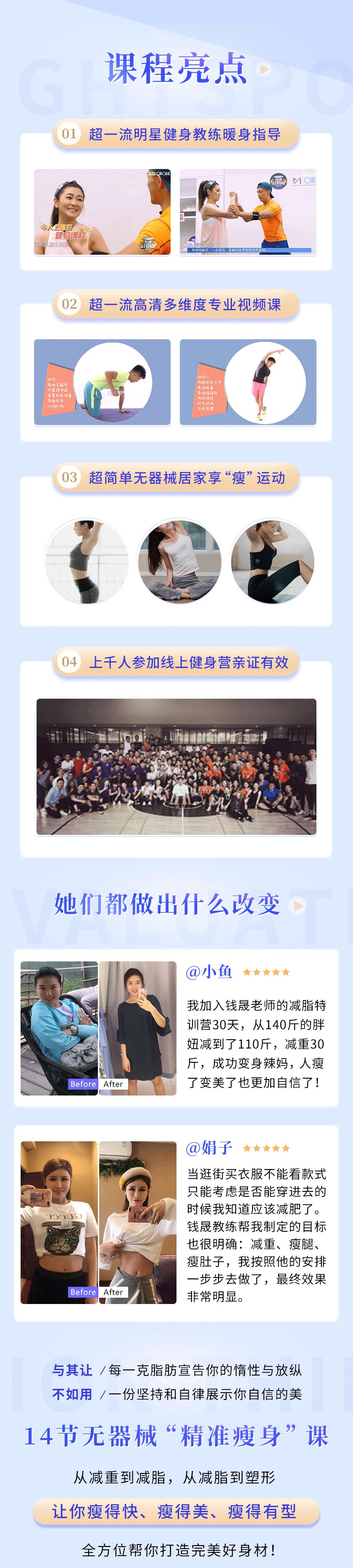 在课程里,钱晟老师会带你针对性精准塑形,小粗腿、小肚子、拜拜袖……想瘦哪里就瘦哪里,你也能露出性感的马甲线!