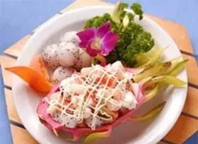 1、整个火龙果切成两边,将火龙果肉挖出来切块,保留完整的火龙果皮外壳作为容器备用; 2、乌梅去核、青瓜去皮切块; 2、将火龙果切块,乌梅,青瓜块和糯米糕一起放入火龙果皮容器中,加蜂蜜即可。 瘦身食谱二 火龙果沙拉 材料:火龙果180克,柠檬沙拉酱25克、橙汁50克。 做法:1、将火龙果去皮起肉,切成丁,盛入容器内待用; 2、把橙汁淋入火龙果四周;3、最后浇上柠檬沙拉酱,即可食用。