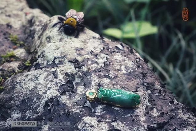 蝉蜕形浊污中,等脱壳化为蝉时,飞到高高的树上,便只饮露水。 18K黄金的底座,凸显了蝉的高洁一面,把翡翠360度牢牢包镶,