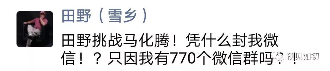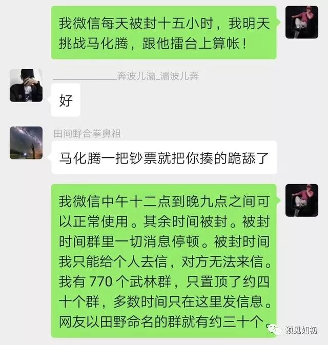 田野在互联网上表示,自己要向马化腾发起挑战!马化腾凭什么封了自己的微信,难道就是因为自己的微信群有七百七十个?自己的微信,当前每天要被封禁十五个小时,自己马上就要挑战马化腾,要和他在擂台上一决生死。自己的微信,只有每天中午十二点到晚上九点能用,其他时间都要被封禁。自己在被封禁的时候,自己微信群里的消息都会被停掉,自己只能给别人发消息,别人都不能给自己发。