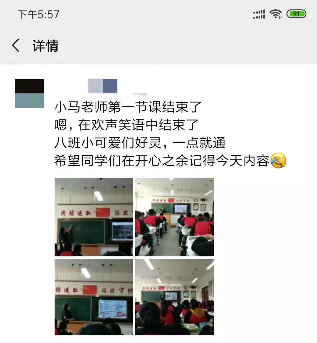 第一个难忘的事情是第一天在走廊被叫“老师好”,那种第一次真正作为老师的幸福感得到了满足。每次一有学生叫我,我就会很积极的回应他们“你好”,因为从小到大,那些回应我的打招呼的老师们,我都觉得特别友善。后来,每天被叫的次数有些多了,就觉得正常了,第一天的那种心情慢慢磨平了,但仍会积极回应。