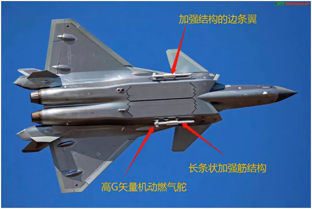这次歼20带的霹雳10实弹要比其他战斗机上的霹雳10长度长,弹身上增加了4条加强筋,6块梯形尾舵(我眼没花,非常仔细的看了,的确是6块尾舵,不信请使劲放大导弹尾部看,这在全世界也是首创),而燃气舵更加突出弹体体外,另外,弹体上仍然保留了长宽的边条翼结构,也是加强结构的举措,这充分说明歼20的这枚霹雳10机动性更强,也就是具有更高的高G的机动水平,这在格斗中是至关重要的。理论上讲,歼20需要在高速的条件下发射格斗弹,而这款歼20专用的霹雳10格斗弹在“拐弯”时承受的应力要比其他霹雳10高的多,所以增加了4根加强筋,可见有多么凶猛!