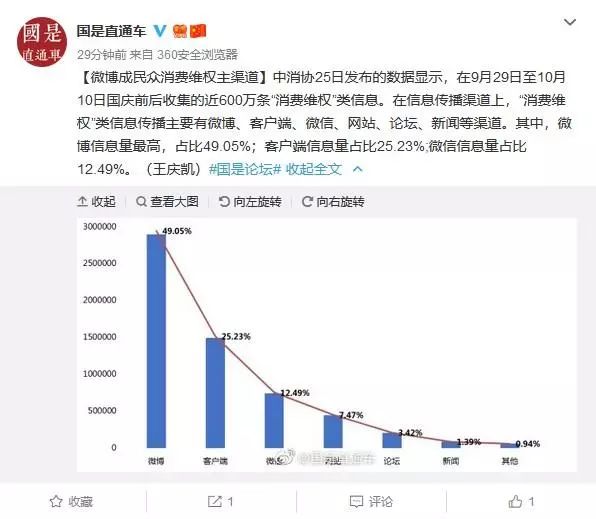 9.微博成民众消费维权主渠道。中消协25日发布的数据显示,在9月29日至10月10日国庆前后收集的近600万条“消费维权”类信息中,以微博信息量最高,占比49.05%。(每经网)
