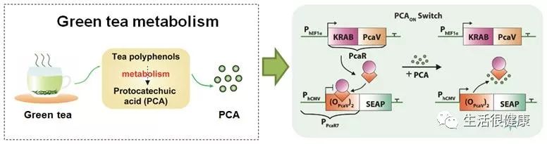 当人体植入某种定制化细胞后,人们只需通过饮用特制的浓缩绿茶,便可使其在体内产生代谢物原儿茶酸进而控制细胞中目的基因的表达。而这种目的基因可按照需求调整改变,可以变为提高人体免疫力的抗体,也变为清除体内有害分子的酶,还可以变为降低血糖的胰岛素。