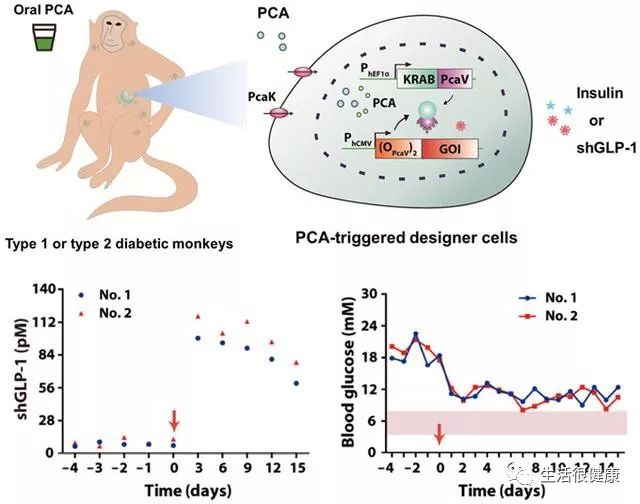 为了测试该可控定制细胞系统放大后在大动物体内的治疗效果及可行性,研究人员将原儿茶酸调控的定制化细胞通过微胶囊包裹后腹腔移植到1型和2型糖尿病猴体内。当糖尿病猴口服PCA后,可以激活调控体内移植的细胞表达释放胰岛素或GLP-1,从而起到降血糖作用。