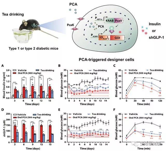 为了实现原儿茶酸或“喝茶”调控基因表达和药物释放治疗疾病的目的,研究人员构建了PCA调控胰岛素(用于1型糖尿病治疗)或者GLP-1(胰高血糖素样肽-1,用于2型糖尿病治疗)表达的基因线路,并将基因线路稳定上载到人底盘细胞HEK-293中,从而获得PCA调控降血糖药物表达释放的人工定制化细胞。这些可控的细胞进一步被微胶囊包裹分别移植到1型或者2型糖尿病模型鼠体内,最终可以实现通过口服PCA或者口服定制的浓缩绿茶调控降血糖药物的表达释放来维持糖尿病小鼠体内的血糖稳态。