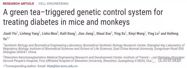 2019年10月24日,国际著名学术期刊《科学·转化医学》(Science Translational Medicine,影响因子:17.2)以封面文章形式在线发表了华东师范大学生命科学学院叶海峰研究员团队题为:A green tea-triggered genetic control system for treating diabetesin mice and monkeys 的最新研究成果。