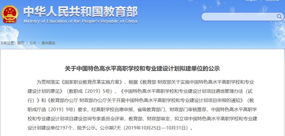 10月25日,教育部公示中国特色高水平高职学校和专业建设计划拟建单位名单,共有197个。
