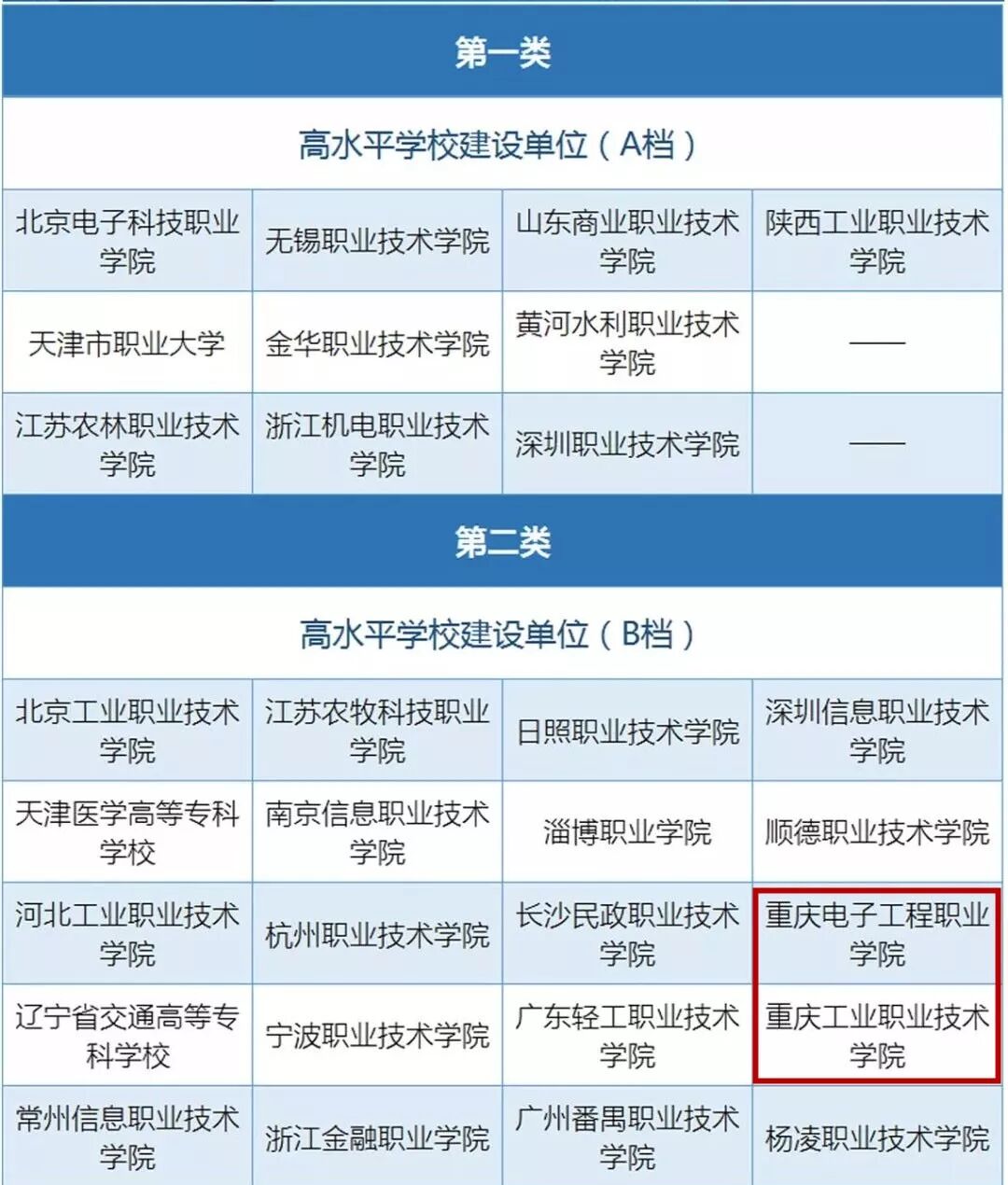 入围“双高计划”的高职院校分为四类,其中第一类包括:高水平学校建设单位(A档)10所;