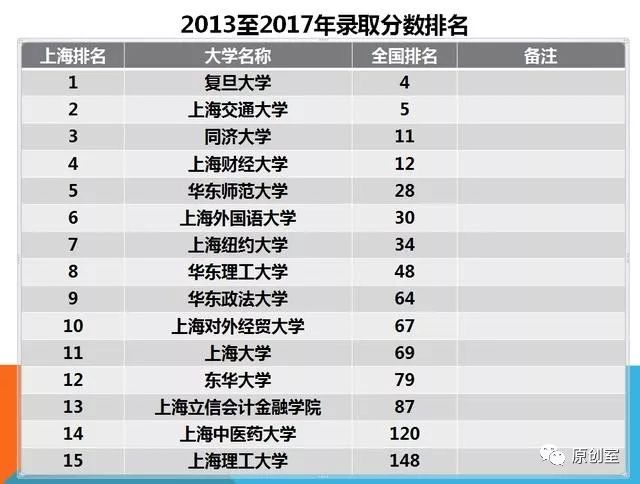 3,我们最后再来参考一下录取分数排行。华东师范大学社会调查中心推出2013至2017年录取分数排行榜(具体名单见下表),在这个排行榜中,上海市有13所高校录取分数线入围全国百强,其中上海纽约大学录取分数排在全国第34位,上海立信会计金融学院排在全国第87位,表现很抢眼。