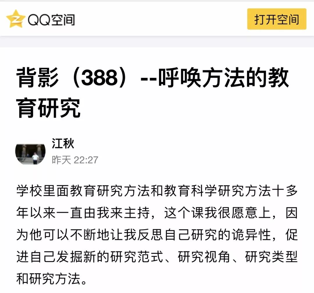 学校里面教育研究方法和教育科学研究方法十多年以来一直由我来主持,这个课我很愿意上,因为他可以不断地让我反思自己研究的诡异性,促进自己发掘新的研究范式、研究视角、研究类型和研究方法。