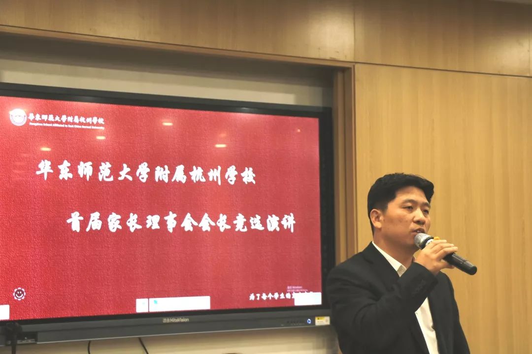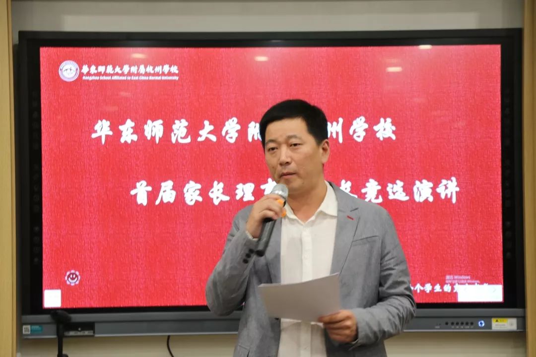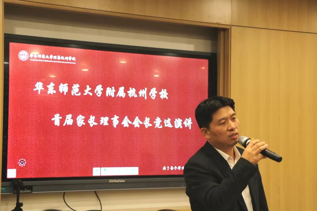 在朱英书记一番动情的开场主持后,首先进行的是“首届家长理事会会长竞选”。104班家长郑军南、303班家长史宇航、701班家长郭松林、702班家长刘周洲参与竞选,家长们在竞选前期做了充分准备,细致研读了《华东师范大学附属杭州学校五年发展规划》。25日晚,四位家长都发表了激情洋溢的演说。