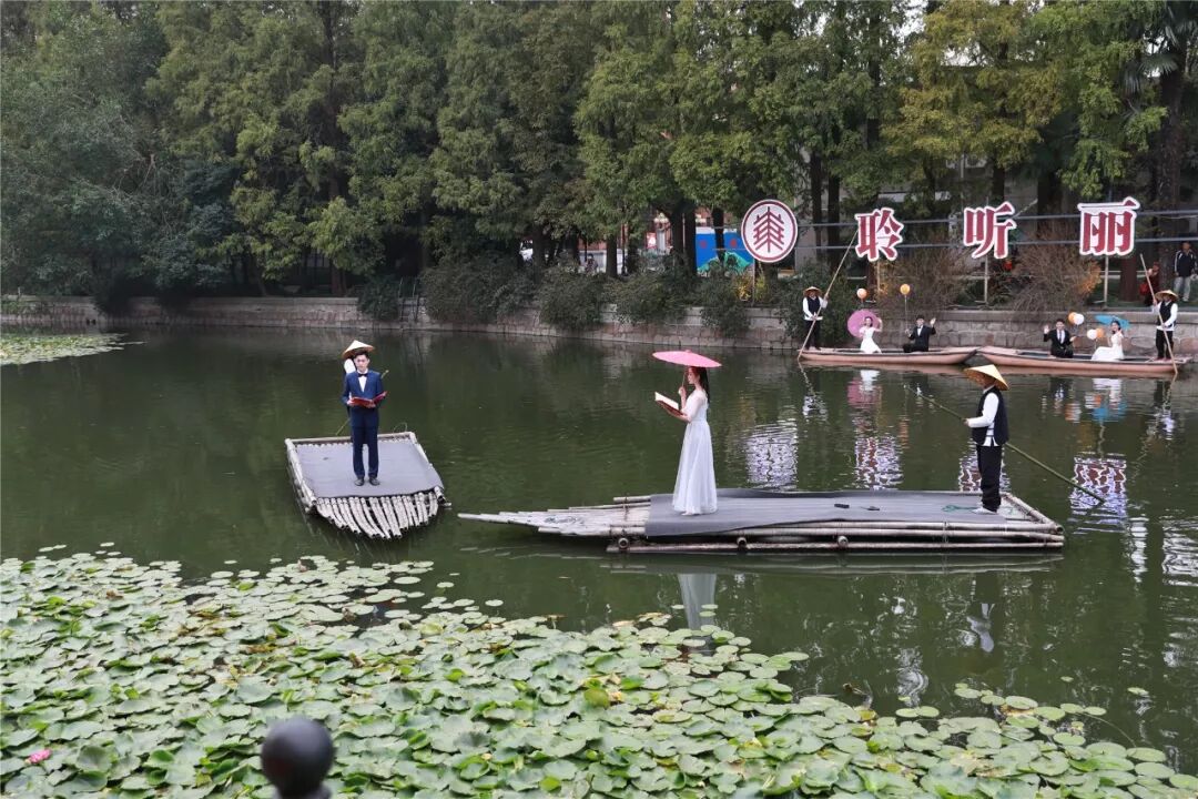 有河的地方,爱情总是更多浪漫肆意。丽娃河为华东师大添了更多诗情画意。《又见丽娃》由夏雨诗社创作,传播学院播音主持艺术专业研究生合诵。本次咖啡文化节还设有“为师大庆生”环节,师生们一起切蛋糕,为华东师大建校68周年送上送福,并合影留念。