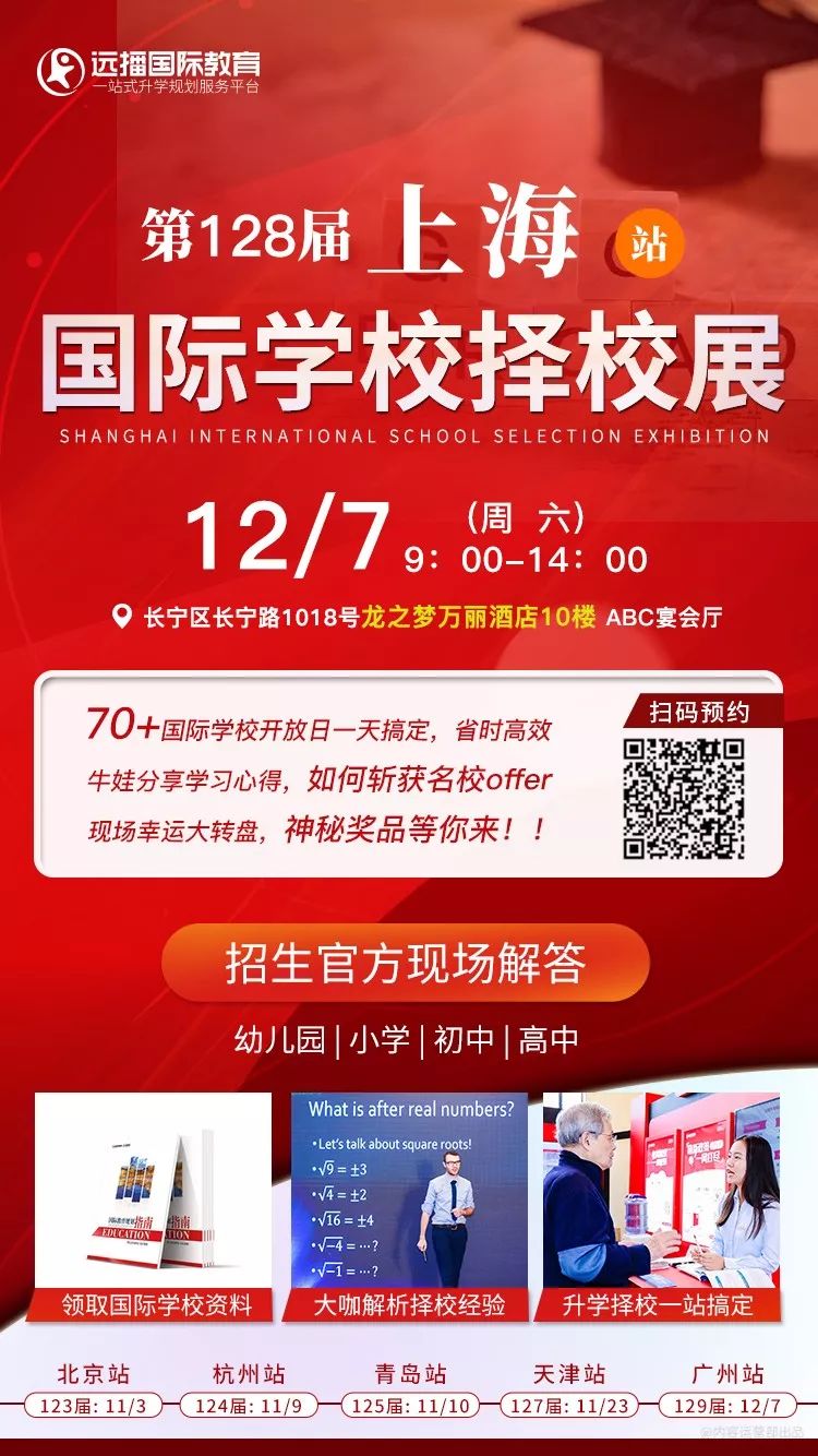 此外,正在为孩子择校的家长现在就可以报名远播12月7日在龙之梦万丽酒店举办的上海展啦!远播为您请到了领科、耀华、上外、光华等优质的国际学校,近距离了解国际学校的情况。