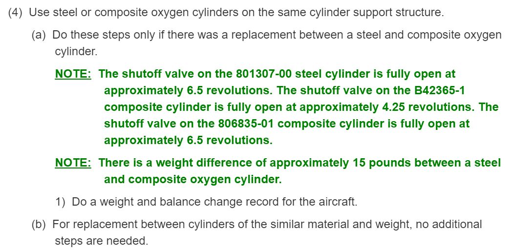 钢瓶比符合材料的氧气瓶重15磅,如果拆下和装上的氧气瓶材料不一样,比如件号801307-00和806835-01互换时,需要填写飞机载重平衡的变更记录。