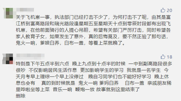 在富川高中路段又有“飞机仔”炸街了当天白天,飞机仔们炸街已经影响到了同学们考试晚上他们又来!这样的行为严重的影响了大家的休息