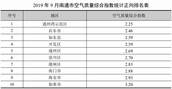 按照《环境空气质量标准》(GB3095-2012)评价,2019 年9月份南通市各地区优良天数达标比例为(海安市) 90.0%~ (崇川区、 如东县、如皋市、通州区) 96.7%。