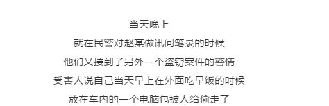 前天早上,赵某在吃早饭的时候,趁被害人不注意,将对方放在车内的这个包给偷走了。