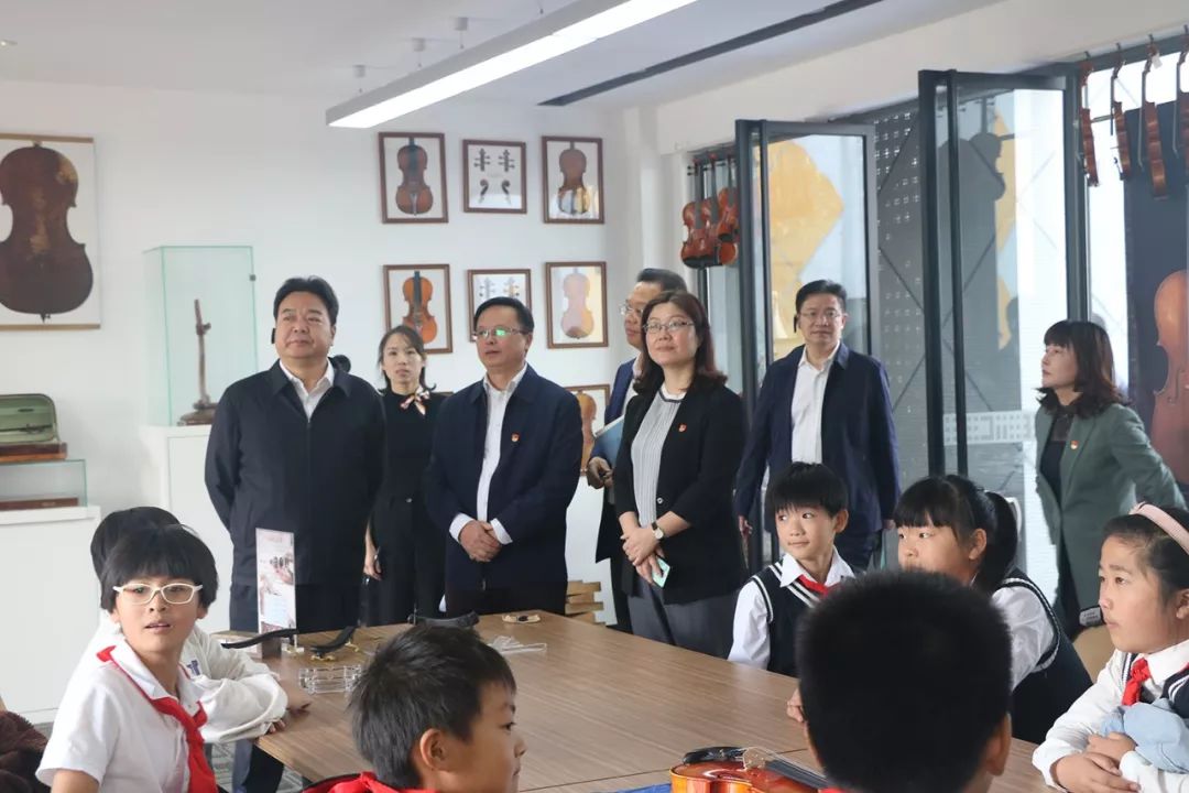 领导们先后参观了东教城的创新教育装备和特色手工教室,对东教城的创新教育场景以及新颖的教学模式给予了极大的赞赏,特别是3D科普影院和提琴教学教室,吸引了领导们的纷纷驻足。