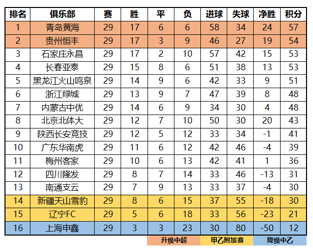 【积分排名】2019赛季中甲联赛第29轮(青岛黄海提前一轮冲超长春亚泰马失前蹄跌至第三,四川南通新疆其中一队参加甲乙附加赛)
