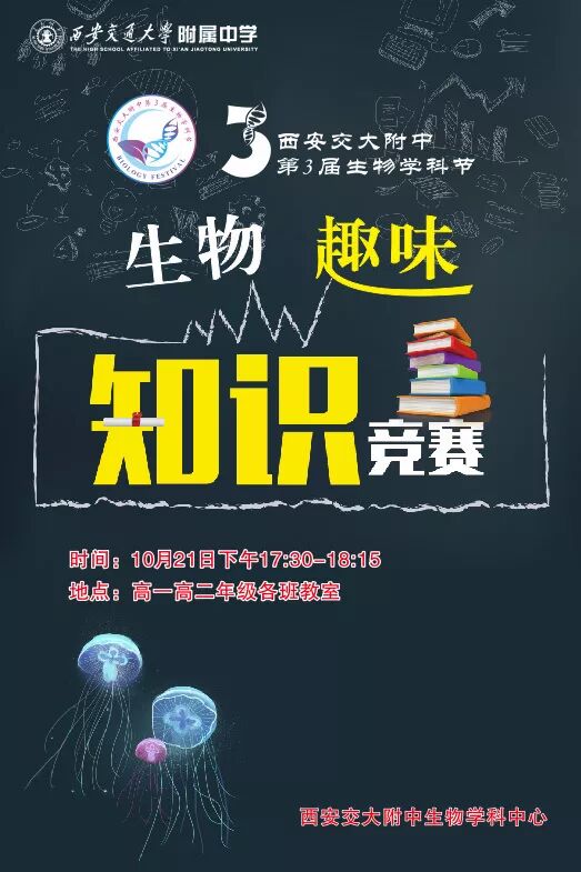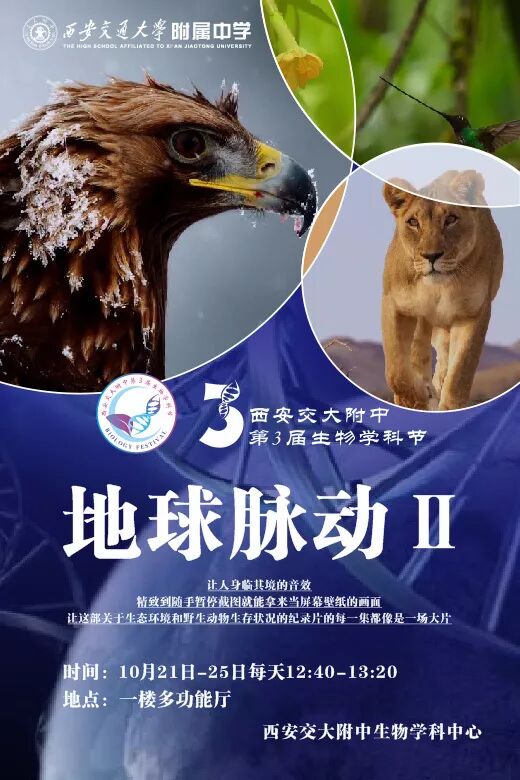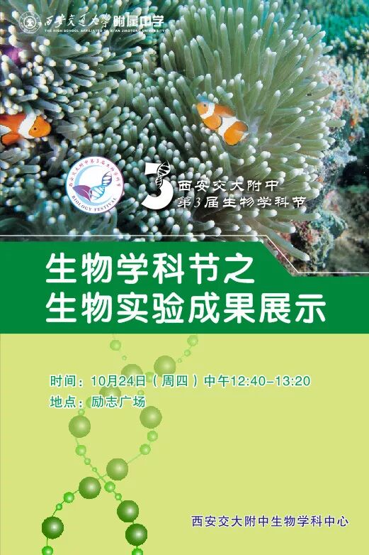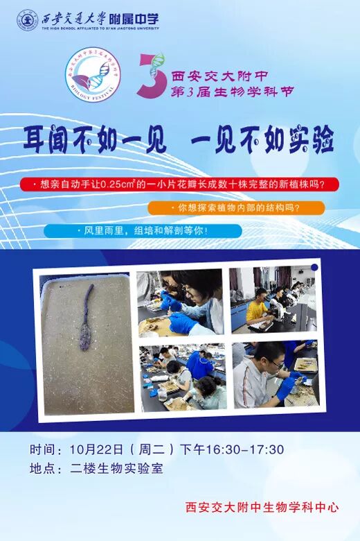 10月21日-25日,西安交大附中成功举办了第三届生物学科节,本届学科节经过生物学科中心全体教师近两个月的精心准备,为同学们呈现了一场场丰富多彩的学科盛宴:五场有质感的科技大片,感受全方位视听体验生命的壮美;同学们自己动手做的高蛋白、可以软化血管降脂的葡萄酒、令人咬牙咧嘴的果醋,感受到舌尖上的生物;高大上的植物组织培养实验,亲眼见证一个细胞变身一个个体的神奇现象;处在科学前沿、具有国际视野的专家讲座,讲述生物学科的日新月异;让人肾上腺素飙升的“一站到底生物趣味知识竞赛”, 增加对生物学更广、更深的认识……