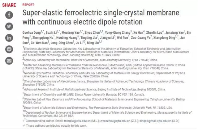 2019年10月25日,西安交通大学刘明,周子尧及丁向东共同通讯在Science在线发表题为“Super-elastic ferroelectric single-crystal membrane with continuous electric dipole rotation”的研究论文,该研究合成了无损伤提离工艺的独立式单晶铁电钛酸钡(BaTiO3)膜。
