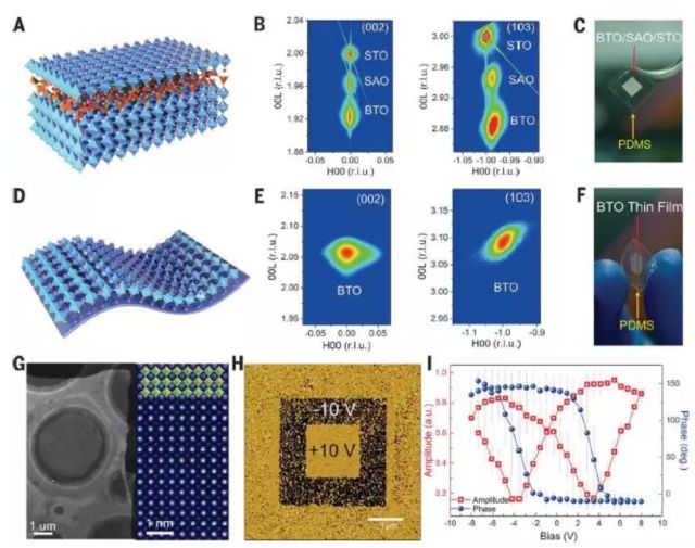 该研究合成了无损伤提离工艺的独立式单晶铁电钛酸钡(BaTiO3)膜。BaTiO3膜在原位弯曲测试过程中可能会发生?180°折叠,这表明它具有超弹性和超柔韧性。
