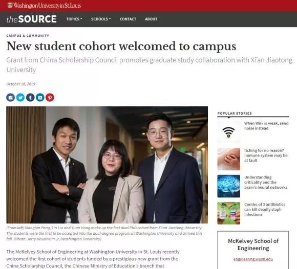 由生命学院承担的西安交通大学与美国圣路易斯华盛顿大学合作的“发育与疾病的遗传学和力学生物学双博士学位”跨学科人才培养项目2019年获得国家留学基金委管理委员会批准。该项目由仿生工程与生物力学研究所牵头实施,生命学院的彭祥军、洪源同学及医学部的柳霖同学成为首批录取学生,他们入学后受到华盛顿大学的热烈欢迎及学校媒体报道。