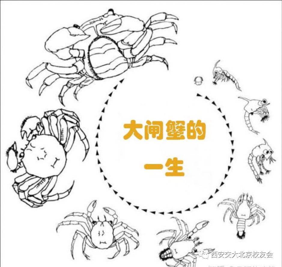 大闸蟹的一生大约是两年时间:春季,它们在长江口咸淡水交界的地方繁殖,孵化出生时仅仅是一些小虫子,即蚤状幼体;小虫子逐渐洄游至淡水湖泊中,经过许多次蜕皮之后,至来年的冬春交际长至一元钱硬币大小,即扣蟹,此时的形态已与平常所见的大闸蟹无异;从此开始大闸蟹进行疯狂地觅食褪壳,至秋风起时,性腺成熟,开始回游大海;待来年春季进行繁殖,到第二年受精卵孵化后就会死去。大闸蟹一生大概要蜕皮18次左右,我们食用的是回游大海之前,褪完最后一次壳的大闸蟹。