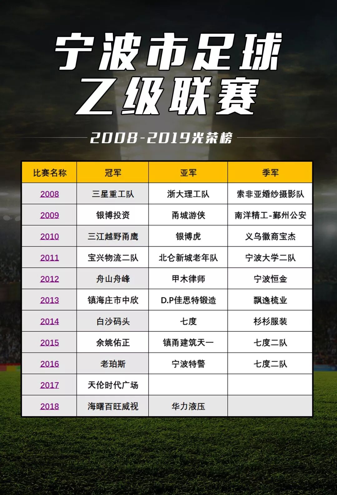 乙级光荣榜比赛名称冠军2008年宁波市“新甬江杯”足球乙级联赛三星重工队2009年“华龙电子杯”宁波市足球乙级联赛银博投资2010年“中国足球彩票杯”宁波市足球乙级联赛三江越野甬鹰2011年“足彩杯”市乙级联赛宝兴物流二队2012年“中国足球彩票杯”市乙级联赛舟山舟峰2013年“中国足球彩票杯”市乙级联赛镇海庄市中欣2014“足彩杯”市足球等级联赛-乙级联赛白沙码头2015年“足彩杯”宁波市足球等级联赛-乙级联赛余姚佑正2016“乐卡童车”宁波市足球等级联赛-乙级联赛老珀斯2017年“天伦时代广场”宁波市足球等级联赛-乙级联赛天伦时代广场2018“威龙.澳船杯”市足球等级联赛-乙级联赛海曙百旺威视