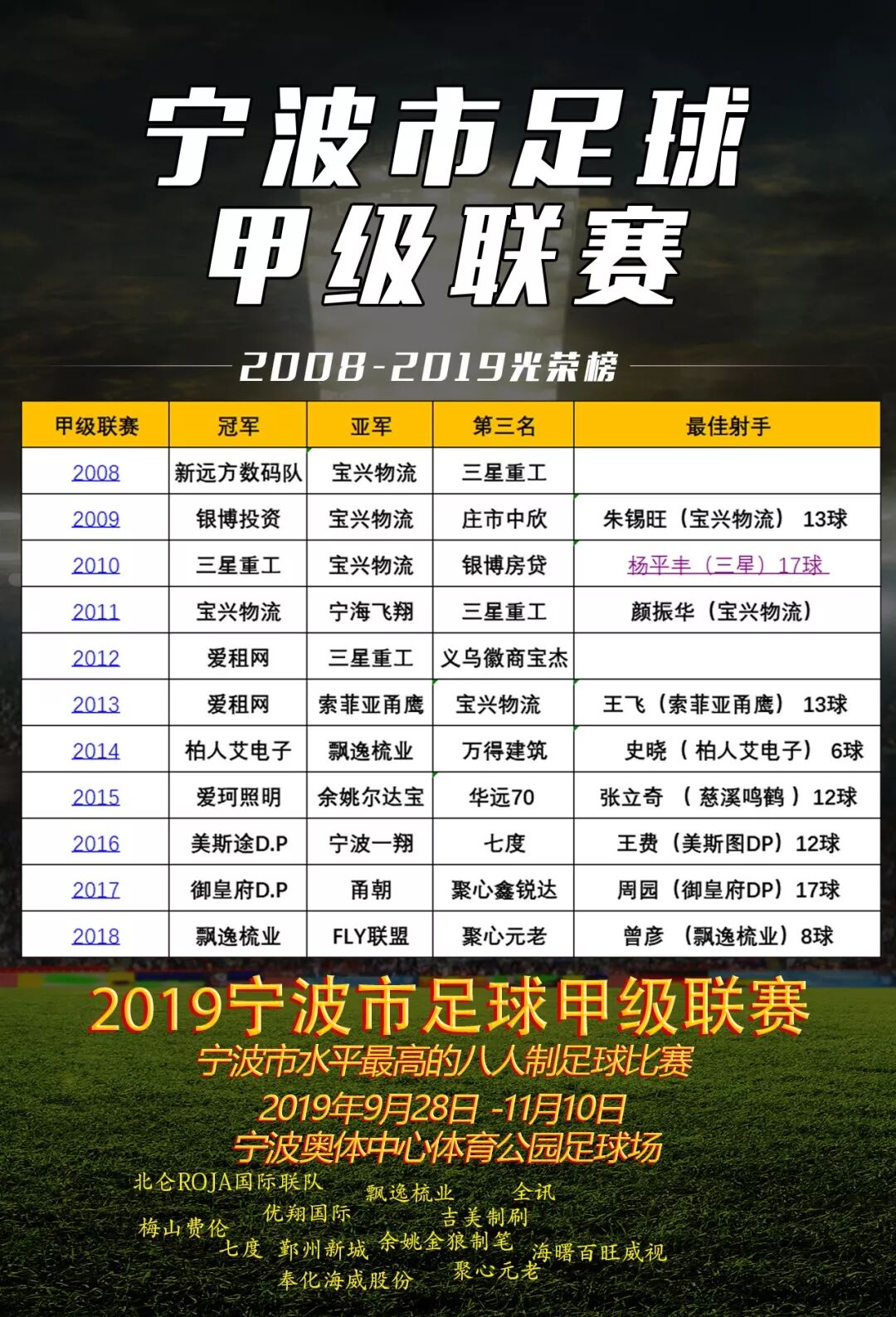 甲级荣耀甲级联赛冠军"迎奥运"2008年宁波市足球甲级联赛新远方数码队2009“荣山杯”宁波市足球甲级联赛银博投资2010年宁波市足球甲级联赛三星重工2011年“足彩杯”市甲级联赛宝兴物流2012年“中国足球彩票杯”市甲级联赛爱租网2013年“中国足球彩票杯”市甲级联赛爱租网2014“足彩杯”市足球等级联赛-甲级联赛柏人艾电子2015年“足彩杯”宁波市足球等级联赛-甲级联赛爱珂照明2016年“美斯途”宁波市足球甲级联赛美斯途D.P2017“美斯途”宁波市足球甲级联赛御皇府D.P2018“威龙.澳船杯”市足球等级联赛-甲级联赛飘逸梳业