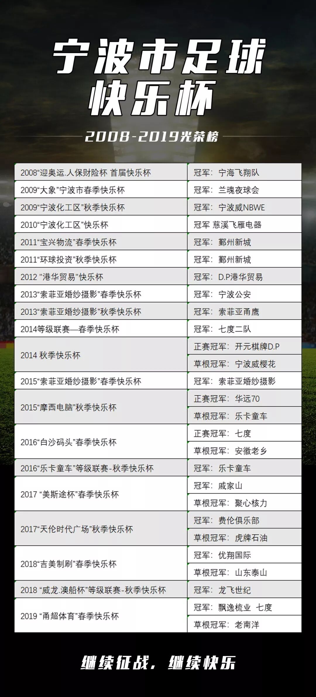 快乐杯光荣榜 2008“迎奥运.人保财险杯 首届快乐杯 冠军:宁海飞翔队 2009“大象”宁波市春季快乐杯 冠军:兰魂夜球会 2009“宁波化工区”秋季快乐杯 冠军:宁波威NBWE 2010“宁波化工区”快乐杯 冠军 慈溪飞雁电器 2011“宝兴物流”春季快乐杯 冠军:鄞州新城 2011“环球投资”秋季快乐杯 冠军:鄞州新城 2012 "港华贸易"快乐杯 冠军:D.P港华贸易 2013“索菲亚婚纱摄影”春季快乐杯 冠军:宁波公安 2013“索菲亚婚纱摄影”秋季快乐杯 冠军:索菲亚甬鹰 2014等级联赛—春季快乐杯 冠军:七度二队 2014 秋季快乐杯 正赛冠军:开元棋牌D.P 草根冠军:宁波威樱花 2015“索菲亚婚纱摄影”春季快乐杯 冠军:索菲亚婚纱摄影 2015“摩西电脑”秋季快乐杯 正赛冠军:华远70 草根冠军:乐卡童车 2016“白沙码头”春季快乐杯 正赛冠军:七度 草根冠军:安徽老乡 2016“乐卡童车”等级联赛-秋季快乐杯 冠军:乐卡童车 2017 “美斯途杯”春季快乐杯 冠军:戚家山 草根冠军:聚心核力 2017“天伦时代广场”秋季快乐杯 冠军:费伦俱乐部 草根冠军:虎牌石油 2018“吉美制刷”春季快乐杯 冠军:优翔国际 草根冠军:山东泰山 2018 “威龙.澳船杯”等级联赛-秋季快乐杯 冠军:龙飞世纪 2019 “甬超体育”春季快乐杯 冠军:飘逸梳业 七度 草根冠军:老南洋