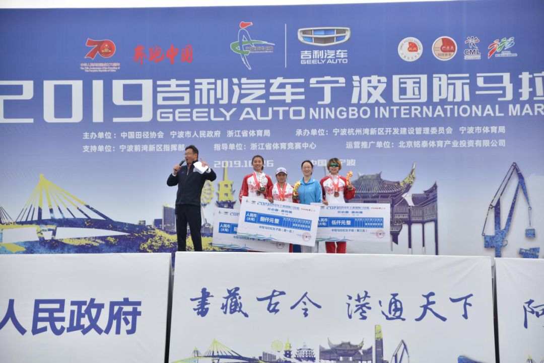 宁波市委副书记、市长裘东耀,宁波市人大常委会副主任、宁波杭州湾新区党工委书记俞雷,宁波市副市长许亚南,中华红丝带基金常务副理事长谷彦芬,浙江省体育局副局长李华,宁波市政府秘书长张良才,慈溪市委书记高庆丰,宁波前湾新区指挥部常务副总指挥陈佳强,宁波市体育局局长张霓,中国田径协会社会活动部副主任赵朴,吉利控股铭泰投资发展集团董事长王兴贵,北京铭泰体育产业投资有限公司总经理叶剑华,为2019宁波国际马拉松鸣枪发令。