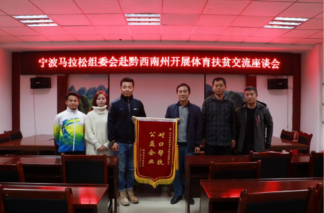 10月18日在黔西南州体育局,王政副局长给予北京铭泰体育颁发锦旗,以表感谢宁波马拉松组委会对黔西南州扶贫事业的贡献,同时为促进东西部协作能更得到进一步深度合作与交流的机会。