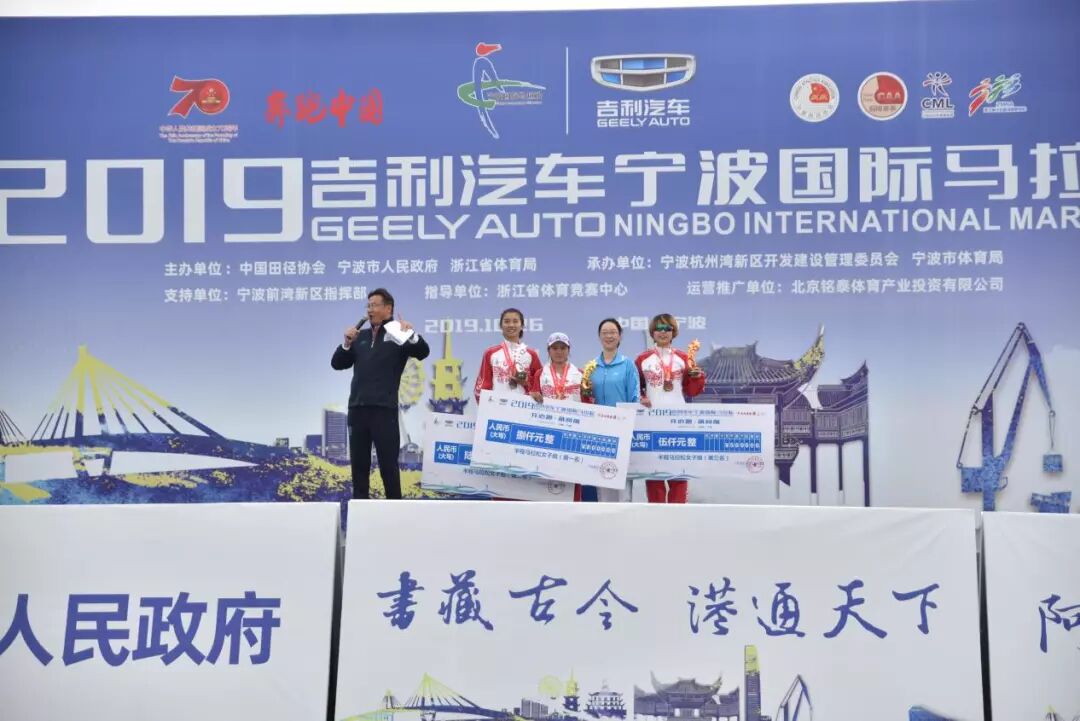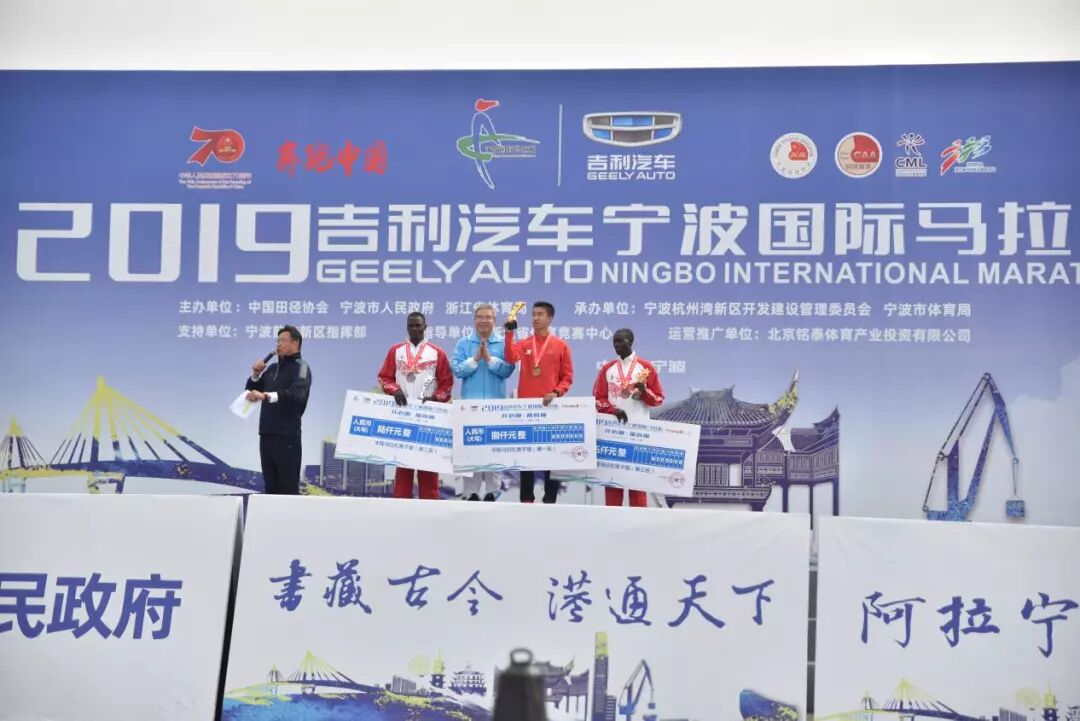 宁波市委副书记、市长裘东耀,宁波市人大常委会副主任、宁波杭州湾新区党工委书记俞雷,宁波市副市长许亚南,中华红丝带基金常务副理事长谷彦芬,浙江省体育局副局长李华,宁波市政府秘书长张良才,慈溪市委书记高庆丰,宁波前湾新区指挥部常务副总指挥陈佳强,宁波市体育局局长张霓,中国田径协会社会活动部副主任赵朴,吉利控股铭泰投资发展集团董事长王兴贵,北京铭泰体育产业投资有限公司总经理叶剑华,为2019宁波国际马拉松鸣枪发令。