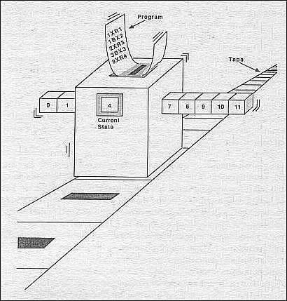 装置由一个控制器和一根假设两端无界的工作带(起存储器的作用)组成。工作带被划分为大小相同的方格,每一格上可书写一个给定字母表上的符号。控制器可以在带上左右移动