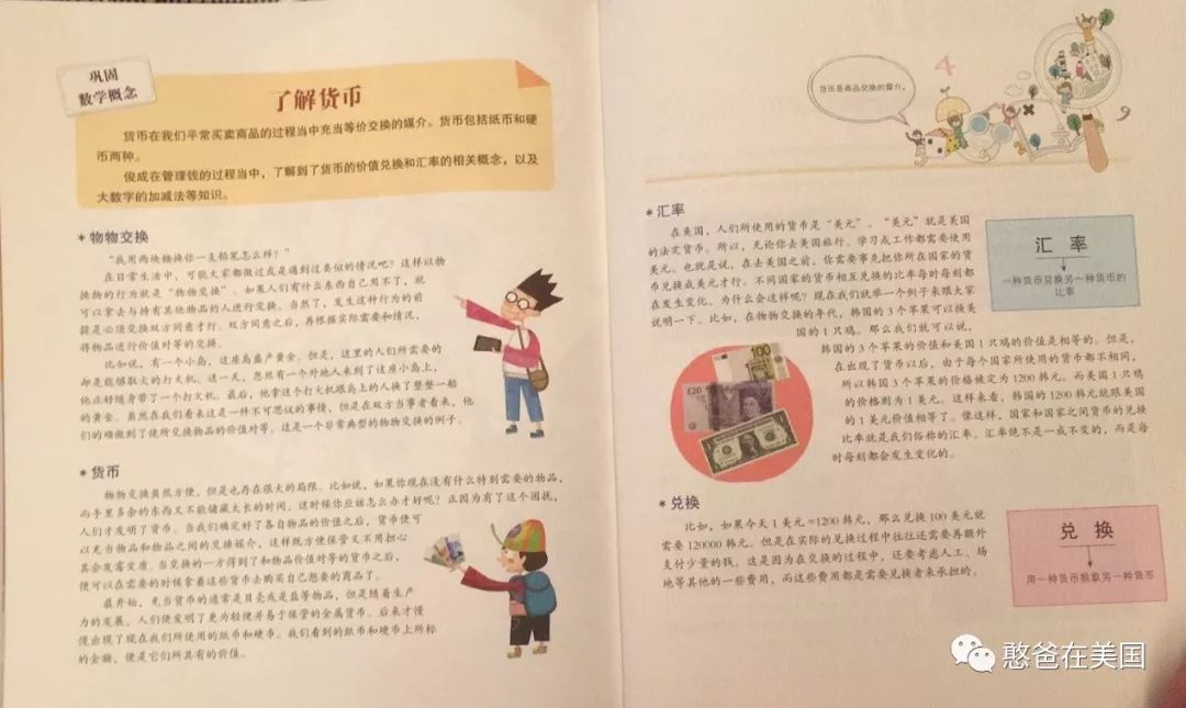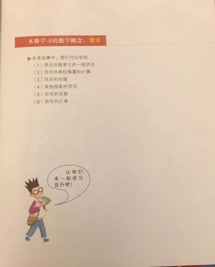 它讲的是测量中的“货币”,他里面涉及6个具体的货币知识点,在一开始就排列出来,让孩子对知识点一目了然:
