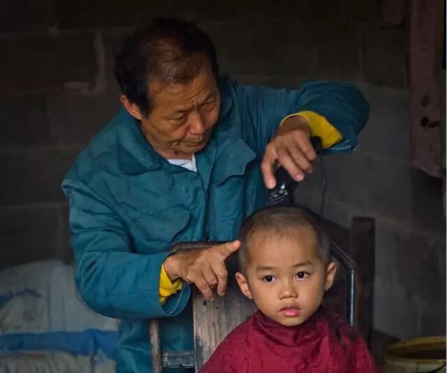 在老家,这种用推子理发的方式,已经不多见了,这位六七岁的小男孩,静静地坐在那里,不发出任何声响。