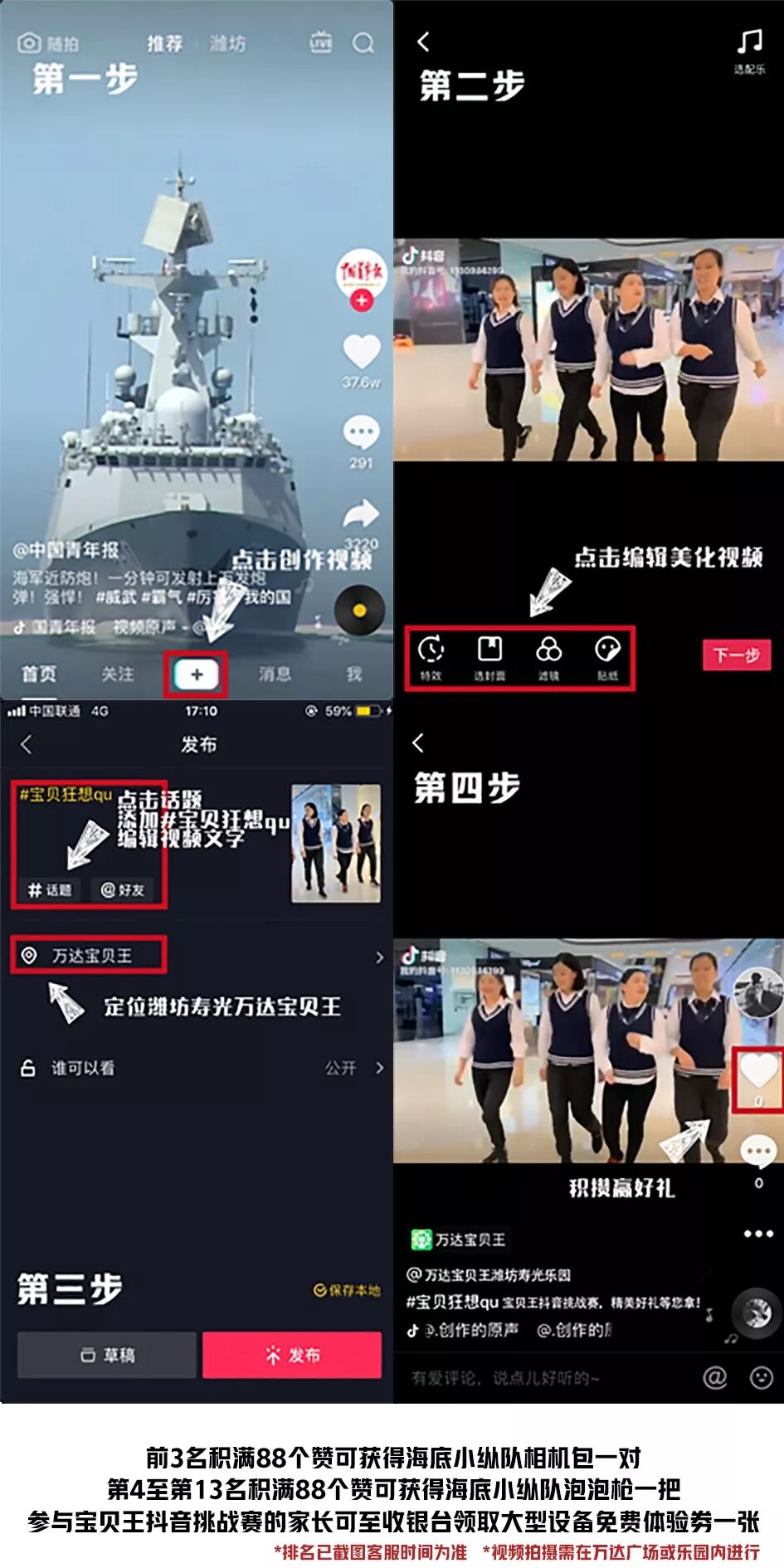前3名积满88个赞可获得海底小纵队相机包一对第4至第13名积满88个赞可获得海底小纵队泡泡枪一把参与宝贝王抖音挑战赛的家长可至宝贝王收银台领取大型设备免费体验劵一张*排名以截图客服时间为准*视频拍摄需在万达广场或乐园内进行