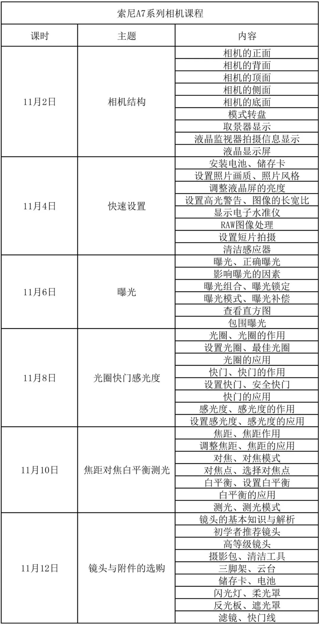 《索尼A7系列相机入门课》一共6次课程:6次课程均为直播上课+在线答疑+录播反复学习,直播上课时间均为下图日期当天20:00-21:30,每次课程均为90分钟。