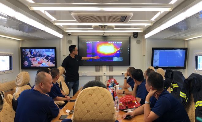 大疆工作人员现场介绍无人机回传实况 仅 5 分钟后,火灾现场的高清影像就已实时回传至现场作战指挥车内,各级指挥中心实现图像同步回传,实时了解到火场真实情况,并及时做出应急指挥处置。