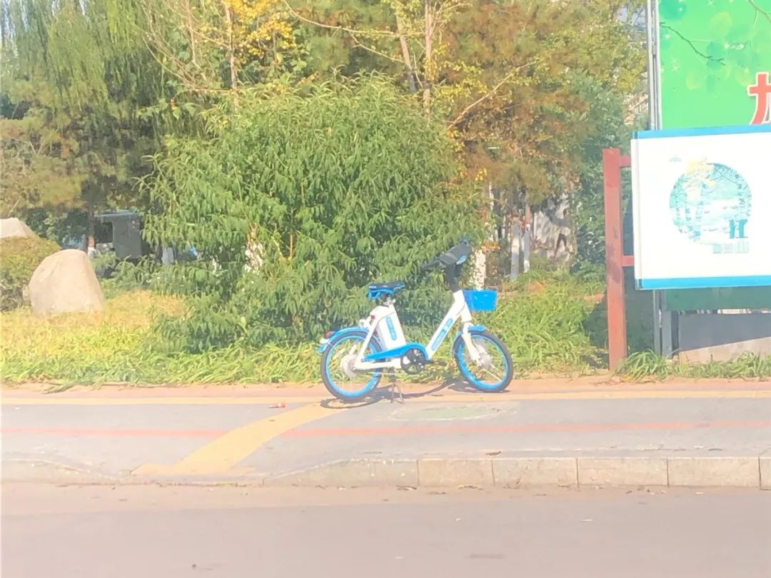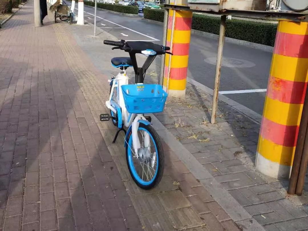 ▲一辆共享单车“规规矩矩”的停在了盲道上