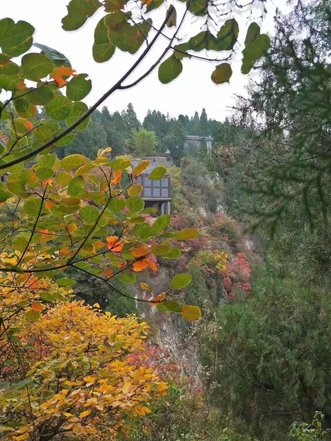 经秋露催色,峡谷中丹霞一片,彰显风姿;齐山上没有单一的火红,而是分层变色,金黄、橙色、紫色、浅红、深红……高低错落,绚彩多姿,阳光铺洒下来,愈加流金溢彩,花色斑斓。自从看了齐山便爱上了秋天,在心里已经形成了一个固定的思维,秋季就应该游齐山,一年中最具韵味的时候,实在不能错过。