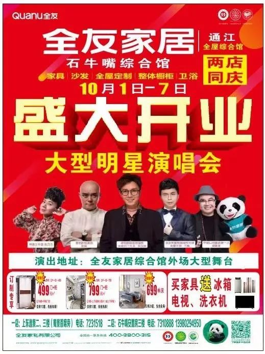 各位朋友注意了!全友家居石牛嘴棕合馆10月1一7日盛大开业了!两店同庆!装新房更方便,快!快!快!0利润征集50套样板间,专业设计团队为你免费设计装修方案,全屋整装,全屋定制,全屋家具全搞定!全新体验!拎包入住!省时!省心!更省钱!买全友家居看明星演唱会,送3张床垫!送对开门冰箱,抽4999大奖!快、快、快错过这次10年难遇哦!