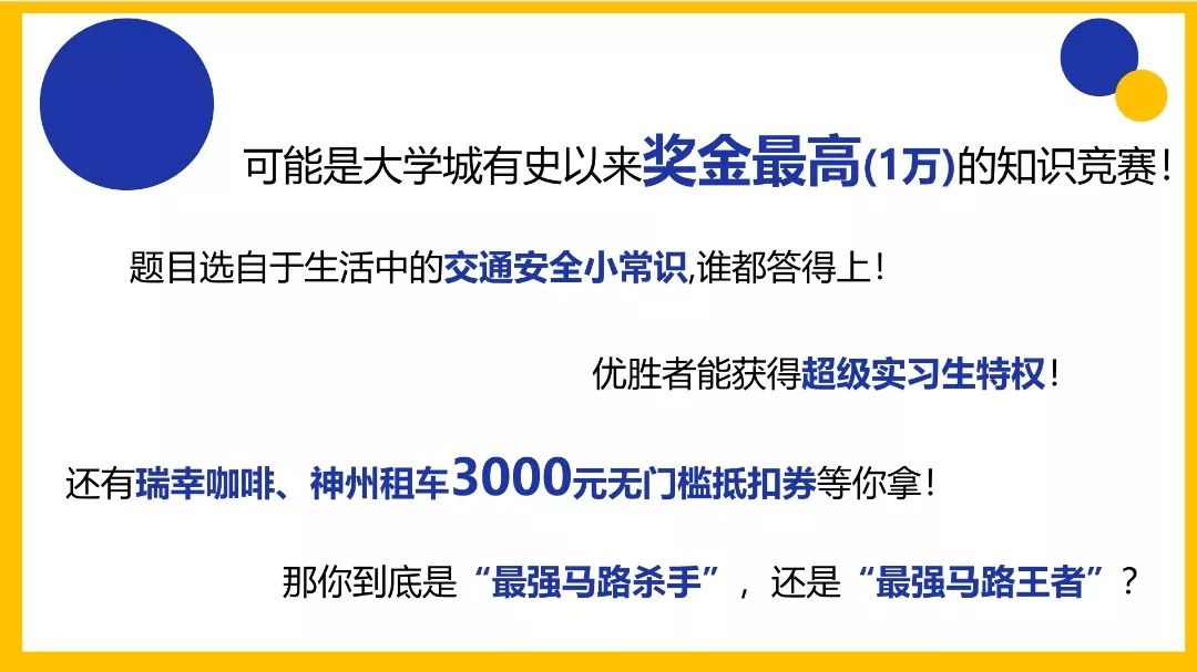 赞助要求:号召学生参与微信h5小游戏知识竞赛(奖金为万元现金大奖,礼品有Luckin coffee无门槛使用券、神州租车无门槛券、保温杯、雨伞等)