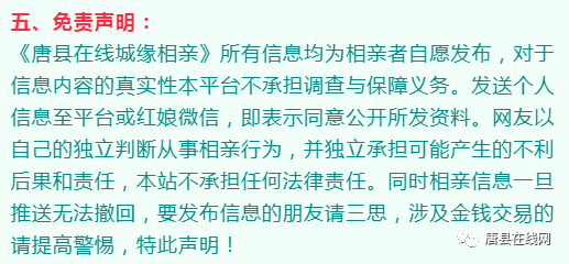 嘉宾照片及信息均由本人上传填写发布,由唐县在线城缘相亲平台版权所有,任何企业、个人、平台不得转载发布,否则将追究相应法律责任。